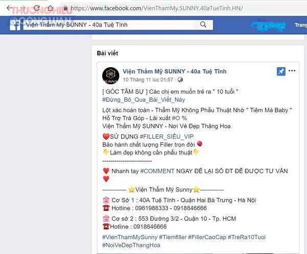 Thời gian qua, Báo Thương hiệu & Công luận đã nhận được phản ánh của khách hàng về việc cơ sở Viện thẩm mỹ Sunny (40A Tuệ Tĩnh, P. Bùi Thị Xuân, Q. Hai Bà Trưng, Hà Nội) có hoạt động, quảng cáo rầm rộ công khai làm những dịch vụ như tiêm filler, tiêm tan mỡ, Glass skin, Baby_Skin, (dùng máu tự thân và mỹ phẩm đặc chế để cấy lên mặt khách hàng)…tại chỗ với những mức giá khác nhau.