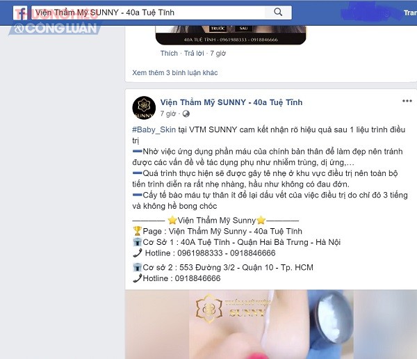 Theo tìm hiểu của PV, viện thẩm mỹ Sunny được UBND quận Hai Bà Trưng cấp giấy chứng nhận đăng ký hộ kinh doanh số 01D8035704 ngày 16/08/2018, phạm vi hoạt động chuyên môn chỉ được chăm sóc làm đẹp cá nhân, chăm sóc da mặt… Tuy nhiên, ghi nhận thực tế trên trang website và cả fanpage facebook vào ngày 13/12, PV tiếp tục phát hiện nhiều nội dung quảng cáo liên quan tới các dịch vụ làm đẹp trái phép như tiêm filler, tiêm giảm mỡ, sử dụng nhưng phương pháp dùng máu tự thân…