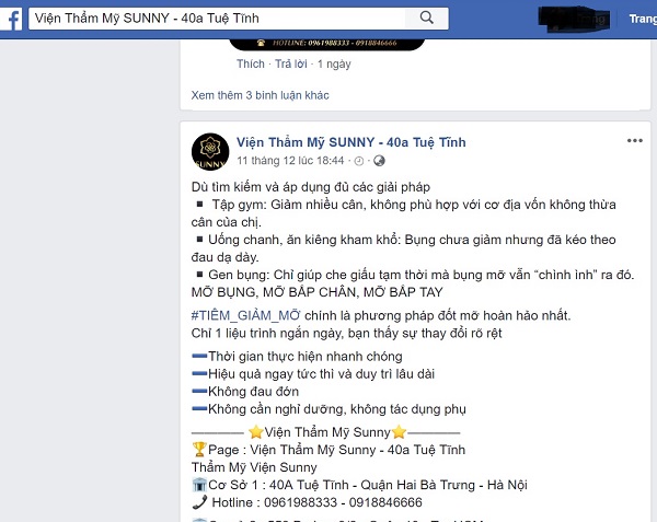 Vào ngày 11/12/2018 - viện thẩm mỹ Sunny vẫn đăng tải quảng cáo dịch vụ không được cấp phép trên fanpage của mình