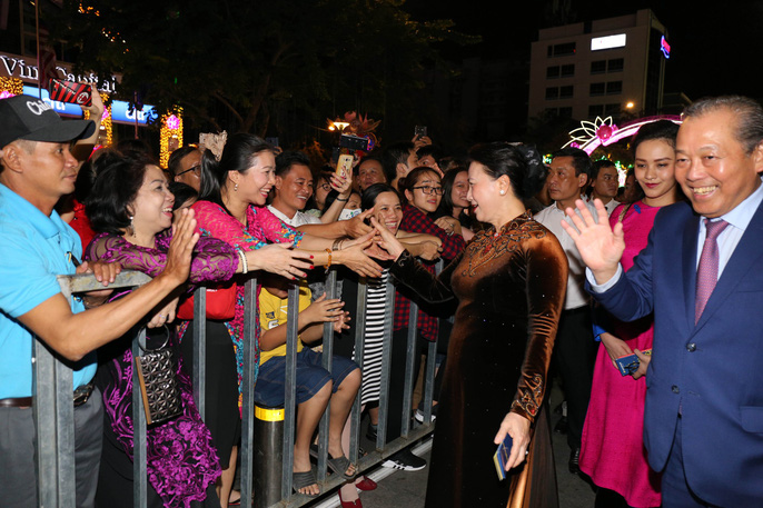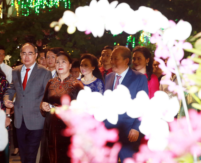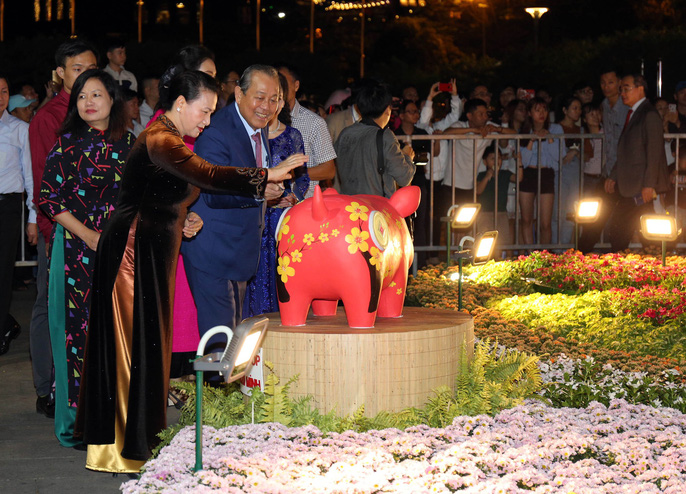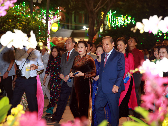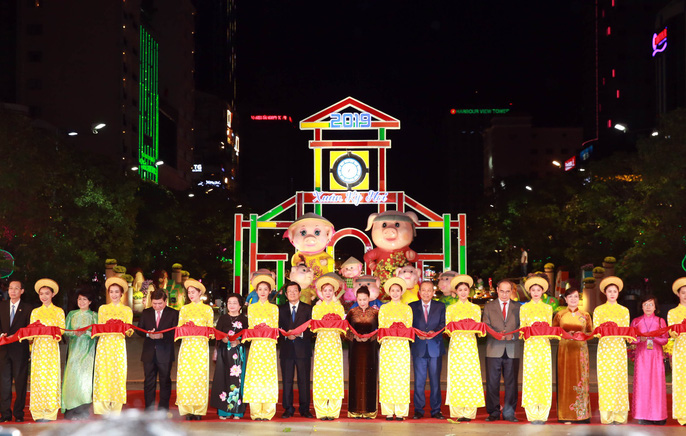 Chủ tịch Quốc hội Nguyễn Thị Kim Ngân và các lãnh đạo Đảng và Nhà nước, lãnh đạo TP HCM cùng cắt băng khai mạc đường hoa Nguyễn Huệ Xuân Kỷ Hợi 2019 vào tối 28 Tết