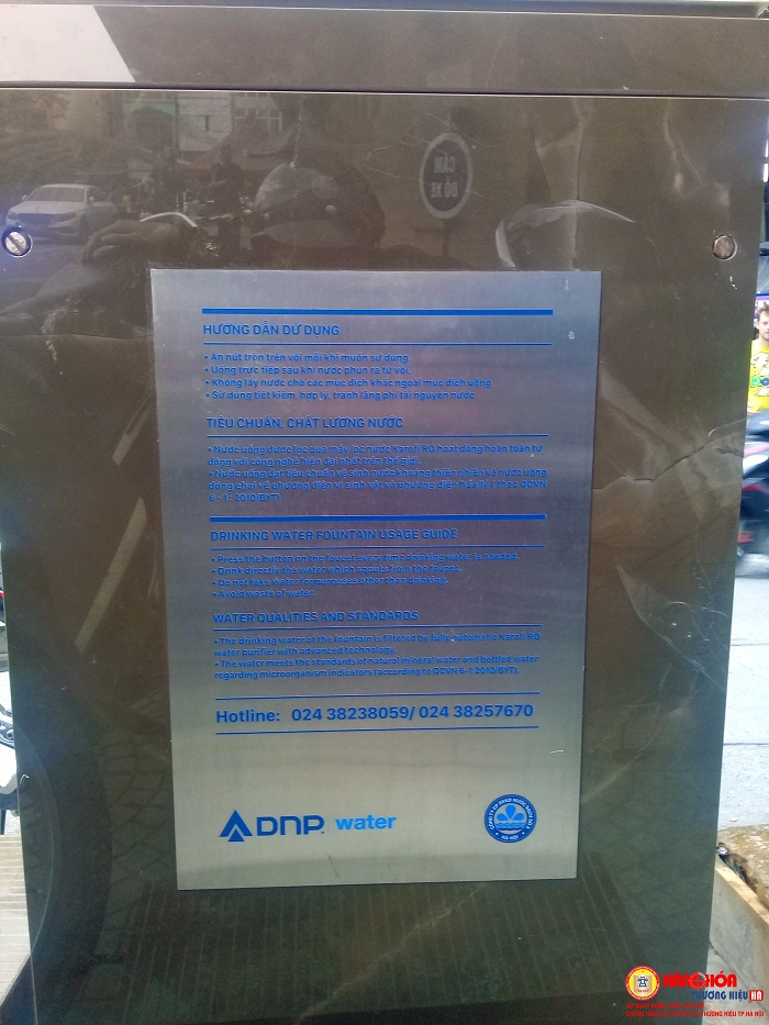 Phía sau trụ có bảng hướng dẫn sử dụng và tiêu chuẩn chất lượng nước.