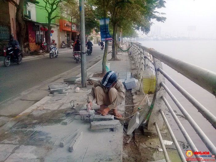 Theo một người công nhân tại đây cho biết: “Công việc lát đá vỉa hè là công việc vất vả, đòi hỏi có cả về kỹ thuật nên chúng tôi đã chia làm 3 đội, mỗi đội có từ 6 đến 7 người cùng nhau làm việc trên những đoạn đường khác nhau, với mục đích đảm bảo được chất lượng cũng như tiến độ của công trình.”