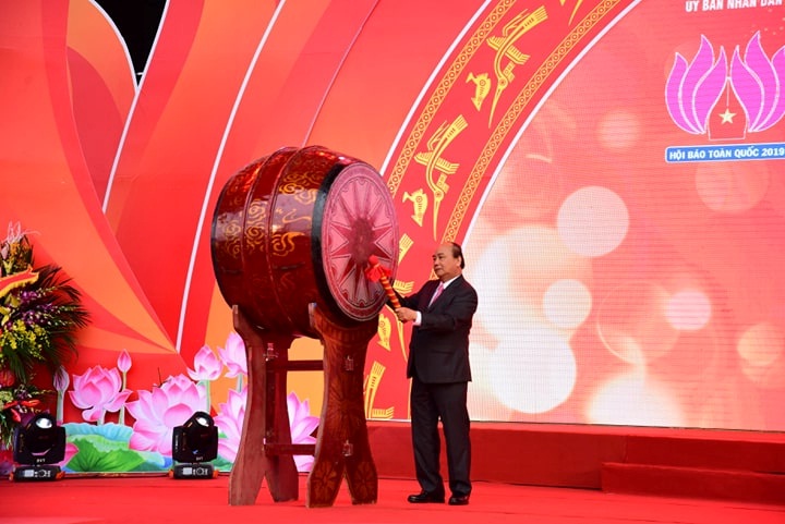 Thủ tướng Nguyễn Xuân Phúc đã đến dự, phát biểu và đánh trống khai mạc Hội Báo toàn quốc 2019 tại Hà Nội.