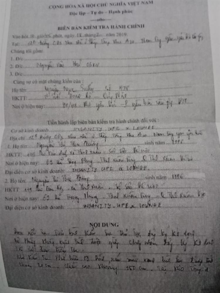 Biên bản kiểm tra hành chính cơ sở Insanity coffee & Lounge kinhd oanh bóng cười.