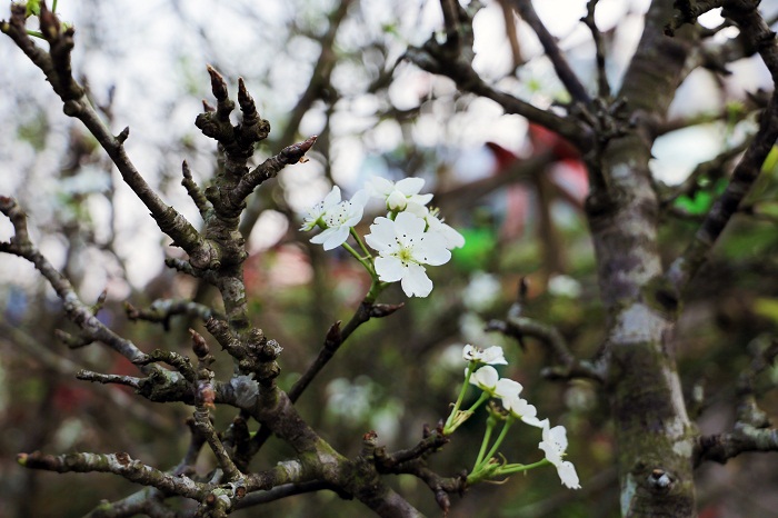 Những cành lê với thân xù xì, hoa lê nở có từ 5 đến 6 cánh tất cả mang trong mình màu trắng tinh khôi, với vẻ đẹp thuần khiết tự nhiên. Đặc biệt hơn, hoa lê là loài hoa có thể mọc thành những chùm hoa nhỏ.