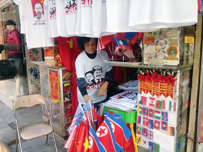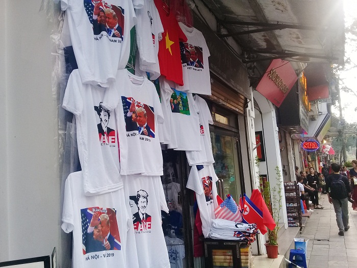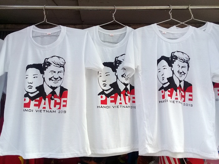 Để chào đón Hội nghị thượng đỉnh Mỹ - Triều lần 2 được tổ chức tại Việt Nam trong 2 ngày 27-28/2, nhiều cửa hàng trên các tuyến phố của Hà Nội đã bày bán những chiếc áo phông có in hình 2 vị lãnh đạo Donald Trump và Kim Jong-un.