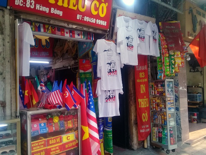 Những ngày này, dọc trên các tuyến phố Hàng Gai hay Hàng Bông (quận Hoàn Kiếm, TP. Hà Nội), nhiều cửa hàng đã bày bán những chiếc áo phông có in hình 2 nhà lãnh đạo Tổng thống Mỹ Donald Trump và Chủ tịch Triều Tiên Kim Jong-un.