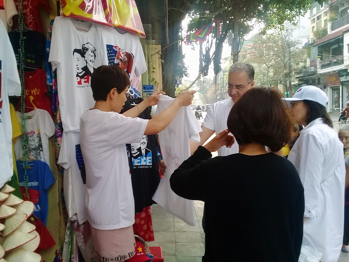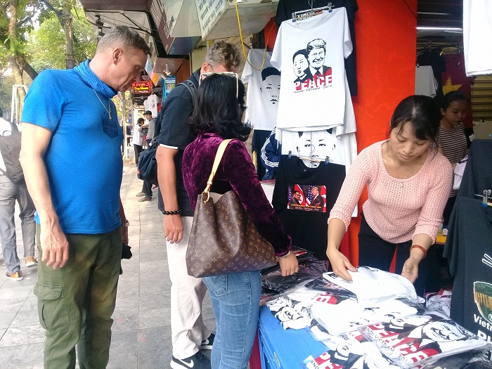 Với sức nóng của Hội nghị thưởng đỉnh Mỹ - Triều, những chiếc áo không chỉ nhận được sự chú ý, quan tâm của người Việt mà ngay cả người nước ngoài đang sinh sống hay đến du lịch ở Hà Nội cũng đều cảm thấy thích thú với những chiếc áo phông in hình chân dung 2 ông Trump – Kim.
