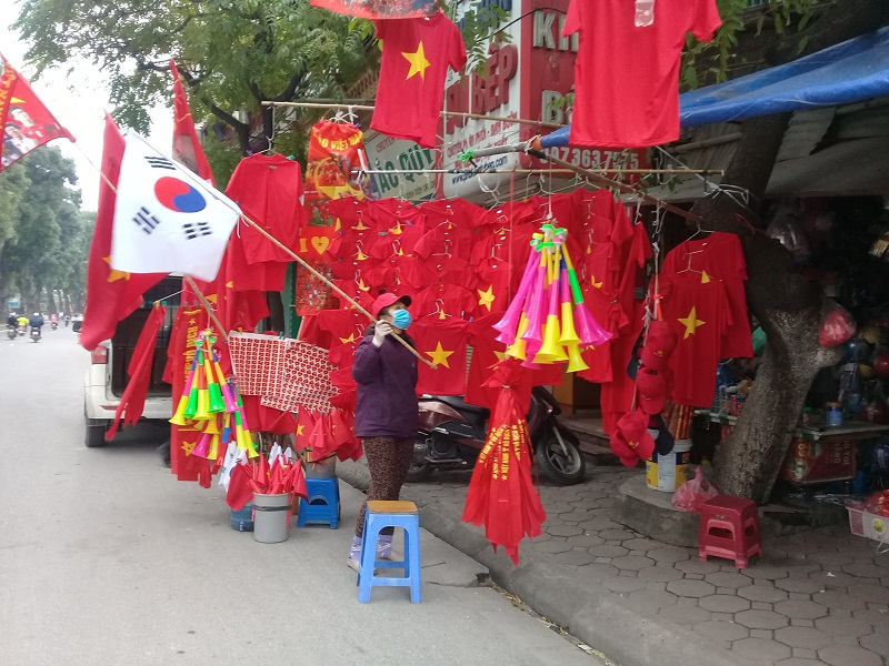 Đi dọc theo những tuyến phố cổ của Hà Nội như phố Huế, Hàng Bài, Hàng Mã, Hàng Gai, Lương Văn Can, Minh Khai...,, không hề khó để bắt gặp những cửa hàng bầy bán cờ đỏ sao vàng, áo tổ quốc, băng rôn cổ vũ bóng đá... Các cửa hàng buôn bán đồ cổ vũ bóng đá cứ mọc lên như nấm bởi sức tiêu thụ mặt hàng này là rất lớn.