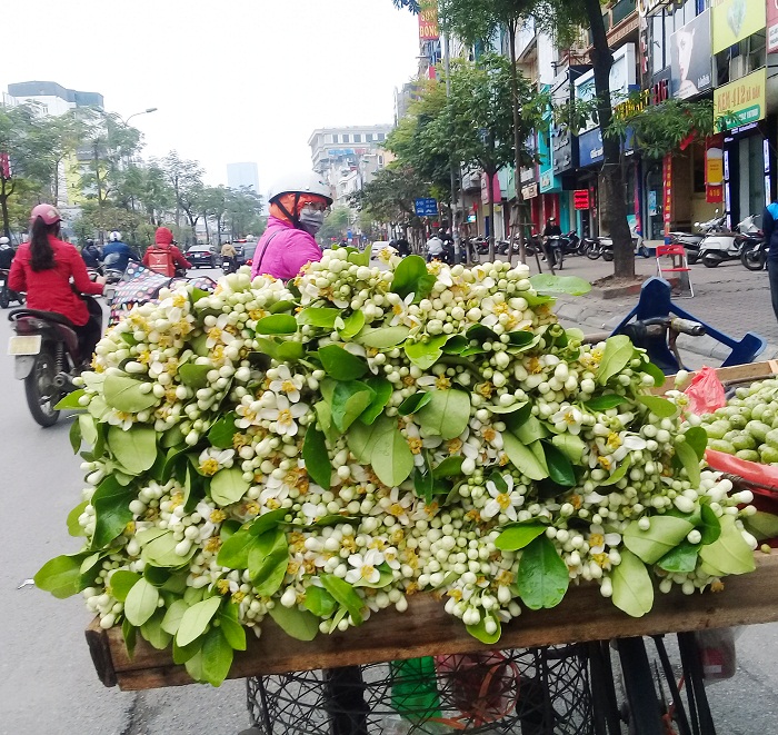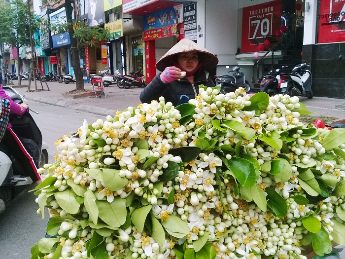 Dạo quanh những tuyến đường quen thuộc như: Xã Đàn, Giảng Võ, Nguyễn Trãi… chúng ta không khỏi bắt gặp những xe hàng rong chở đầy hoa bưởi mang trong mình màu trắng tinh khôi, phảng phất mùi thơm cuộn vào trong gió lan toả khắp một vùng.