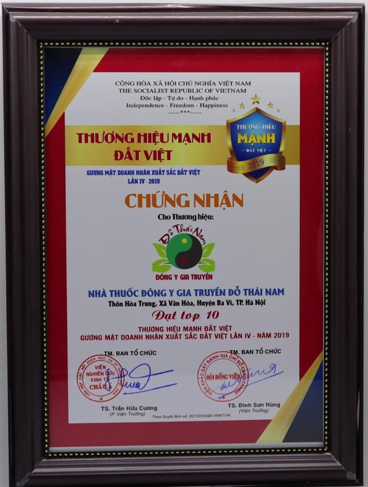 Ghi nhận những đóng góp thiết thực cho sự nghiệp chăm sóc và bảo vệ sức khỏe vì cộng đồng, Nhà thuốc Đông y Gia truyền Đỗ Thái Nam đã vinh dự nhận được chứng nhận Top 10 Thương hiệu dẫn đầu Việt Nam năm 2019, Thương hiệu mạnh Đất Việt, gương mặt Doanh nhân xuất sắc Đất Việt năm 2019, Thương hiệu nhãn hiệu uy tín Ba Miền năm 2020.... Giải thưởng cao quý ấy là động lực to lớn để Lương y An Quốc Huynh – người kế thừa Nhà thuốc Đông y Gia truyền Đỗ Thái Nam không ngừng nỗ lực để ngày càng cứu chữa được nhiều người bệnh hơn nữa, mang lại những giá trị sống tốt đẹp cho người, cho đời.