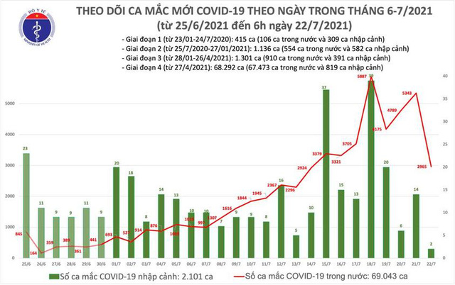 Tính đến sáng ngày 22/7, Việt Nam có tổng cộng 71.144 ca mắc, trong đó có 2.101 ca nhập cảnh và 69.043 ca mắc trong nước.