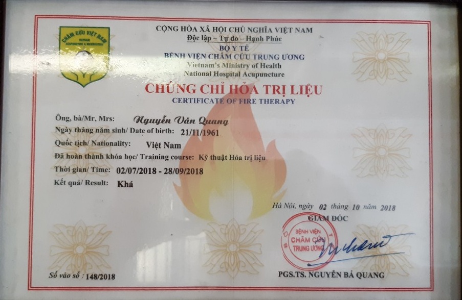 Chứng chỉ hỏa trị liệu của lương y Nguyễn Văn Quang