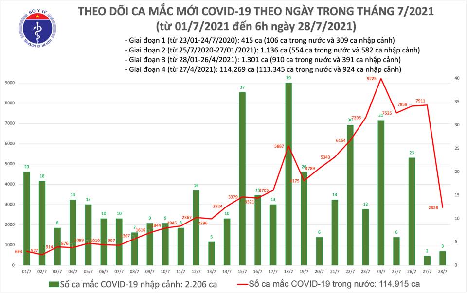 Tính đến sáng ngày 28/7, Việt Nam có tổng 117.121 mắc, trong đó có 2.206 ca nhập cảnh và 114.915 ca mắc trong nước.