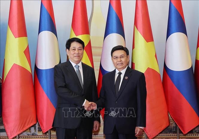 Tổng Bí thư, Chủ tịch nước Lào Thongloun Sisoulith đón tiếp Chủ tịch nước Việt Nam Lương Cường. Ảnh TTXVN