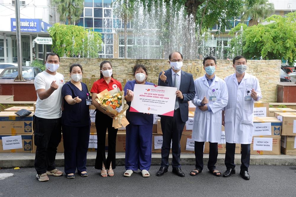 Ông Park Jong Sun - Trưởng Đại diện Tổng cục Du lịch Hàn Quốc và đại diện Hội chữ thập đỏ Việt Nam trao quà tặng tiếp sức cho đội ngũ y bác sĩ tại BV Thanh Nhàn - Hà Nội.