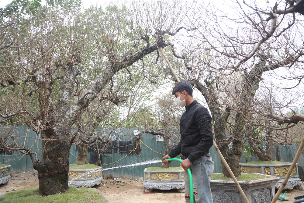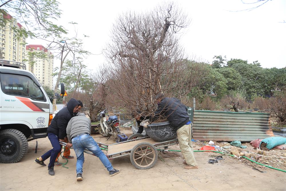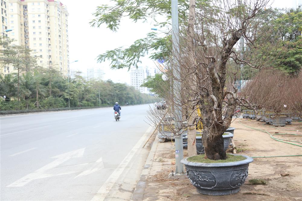 Dọc tuyến đường Võ Chí Công (quận Tây Hồ, Hà Nội), nhiều nhà vườn đã bày bán nhiều gốc đào thế “khủng” có giá trị cao.