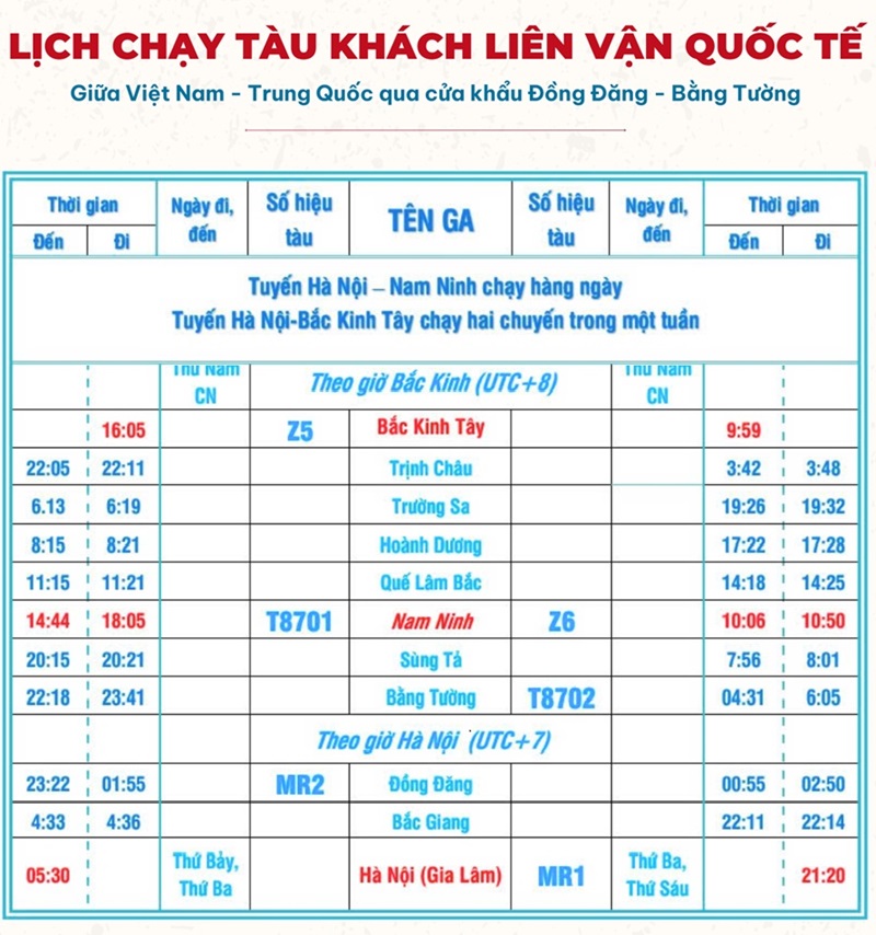 Lịch chạy tàu khách liên vận quốc tế giữa Việt Nam – Trung Quốc qua cửa khẩu Đồng Đăng – Bằng Tường.