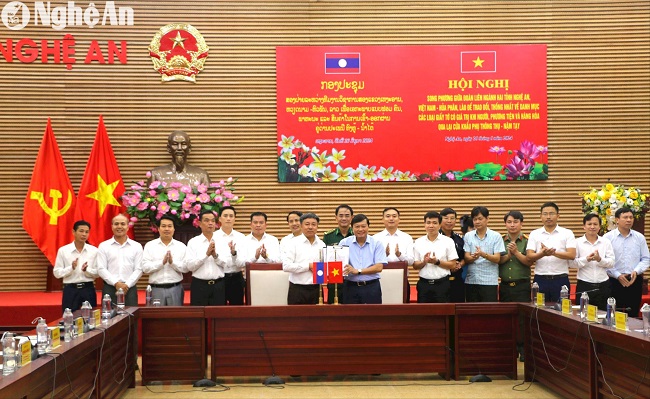 Đại diện đoàn liên ngành 2 tỉnh Nghệ An - Hủa Phăn đã ký kết biên bản thống nhất danh mục các loại giấy tờ có giá trị khi người, phương tiện và hàng hóa qua lại cặp cửa khẩu phụ Thông Thụ - Nậm Tạy.