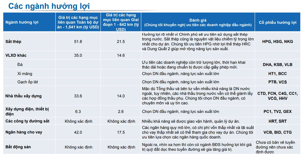 Dự án quy mô khổng lồ này không chỉ là một công trình giao thông, mà còn là một động lực mạnh mẽ thúc đẩy phát triển kinh tế, tạo ra hiệu ứng lan tỏa rộng khắp các ngành nghề. Theo phân tích của Chứng khoán Yuanta, một số ngành công nghiệp sẽ được hưởng lợi trực tiếp từ dự án, bao gồm: sắt thép, vật liệu xây dựng (VLXD), xây dựng, điện và thiết bị điện, vận tải đường sắt, ngân hàng và bất động sản.