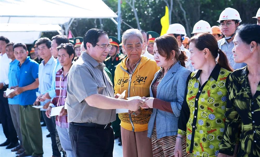 Thủ tướng thăm hỏi tặng quà lực lượng thi công và người dân tại điểm xây dựng tuyến giao thông ra đảo Hòn Khoai.