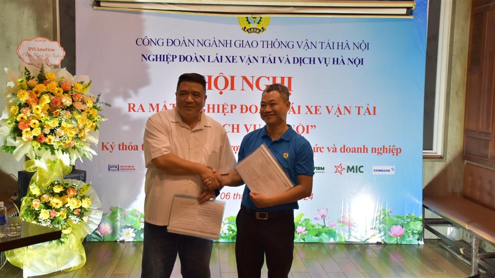 Ông Lê Xuân Bình - Chủ tịch Nghiệp đoàn Lái xe ô tô công nghệ Hà Nội và ông Trịnh Tống Giang - Chủ tịch Nghiệp đoàn Lái xe vận tải và Dịch vụ Hà Nội đã trao thoả thuận hợp tác, phối hợp gữa hai đơn vị trong hoạt động và phong trào thi đua.