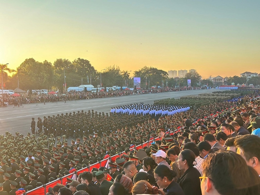 Ngay sau phần diễn văn, chương trình diễu binh – diễu hành được tổ chức hoành tráng với sự tham gia của lực lượng vũ trang, các bộ, ngành và quần chúng nhân dân. Các khối diễu binh tái hiện sống động hành trình 50 năm xây dựng và bảo vệ Tổ quốc, khẳng định sức mạnh đoàn kết, bản lĩnh và ý chí của nhân dân Lào.