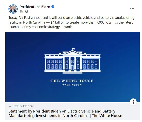 Tài khoản Twitter và Facebook của Tổng thống Biden cũng chia sẻ lại tuyên bố của ông Biden. Các bài đăng đều nêu bật thông tin VinFast sẽ xây nhà máy sản xuất pin và ô tô điện ở bang Bắc Carolina với vốn đầu tư 4 tỉ USD.