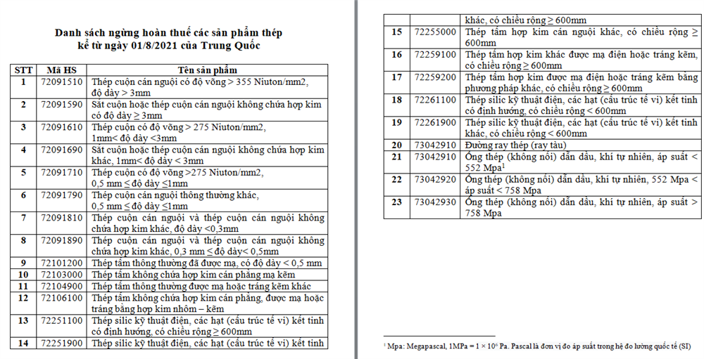 Danh sách 23 sản phẩm thép ngừng hoàn thuế của Trung Quốc kể từ ngày 01/8/2021. Ảnh: Chụp màn hình