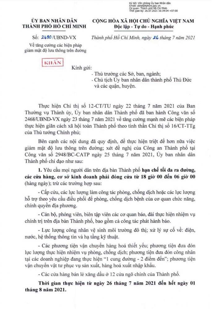 Bên cạnh các nội dung đã quy định trong thực hiện triệt để giãn cách xã hội theo Chỉ thị 16 tăng cường, UBND TP. Hồ Chí Minh yêu cầu người dân trên địa bàn thành phố hạn chế tối đa ra đường, các cửa hàng, cơ sở kinh doanh phải đóng cửa từ 18h đến 6h hàng ngày. Áp dụng từ 18h tối nay đến hết ngày 1/8.