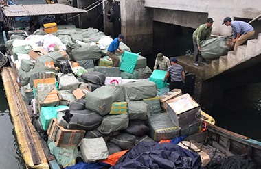 Qua kiểm tra sơ bộ và khai báo của các thuyền viên, phương tiện tàu gỗ không số đang vận chuyển các thùng carton, thùng xốp, bao tải bên trong chứa nhiều mặt hàng khác nhau như: phụ tùng xe máy, linh kiện điện tử, cá khô, quần áo, mỹ phẩm….