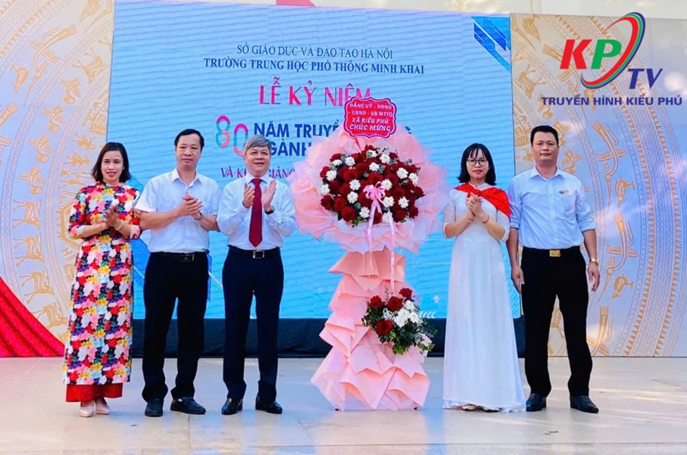 Đ/c Đào Đức Anh - Phó bí thư thường trực xã Kiều Phú tặng hoa trường THPT Minh Khai (ảnh: TT VH- TT - TT Kiều Phú)