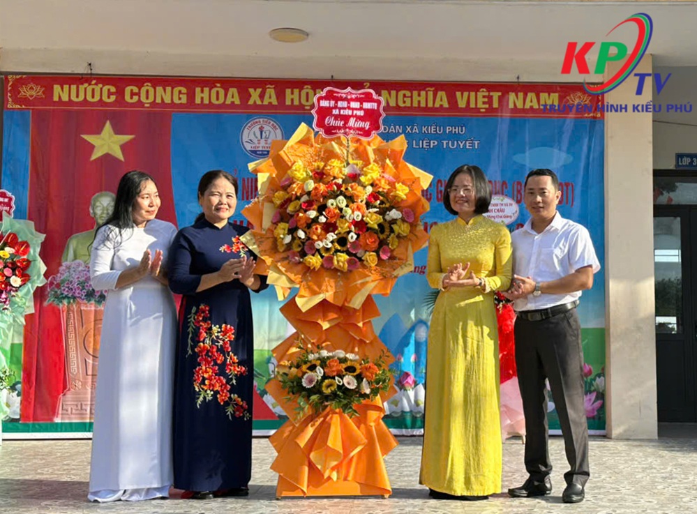 Đại diện UBND xã Kiều Phú tặng hoa tại điểm trường Liệp Tuyết (ảnh: TT VH- TT - TT Kiều Phú)
