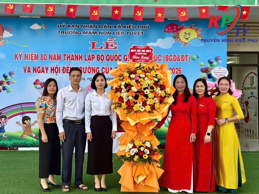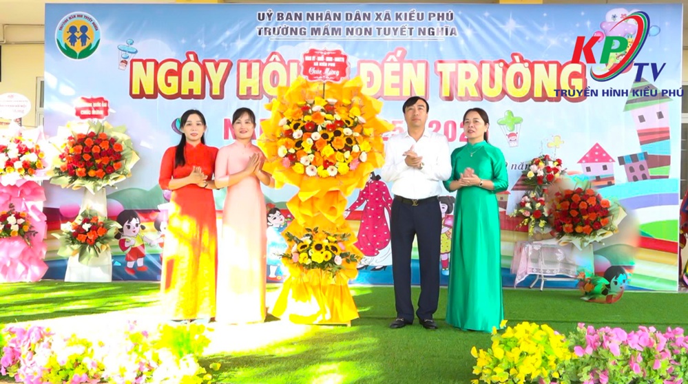 Đại diện UBND xã Kiều Phú tặng hoa trường mầm non Tuyết Nghĩa (ảnh: TT VH- TT - TT Kiều Phú)