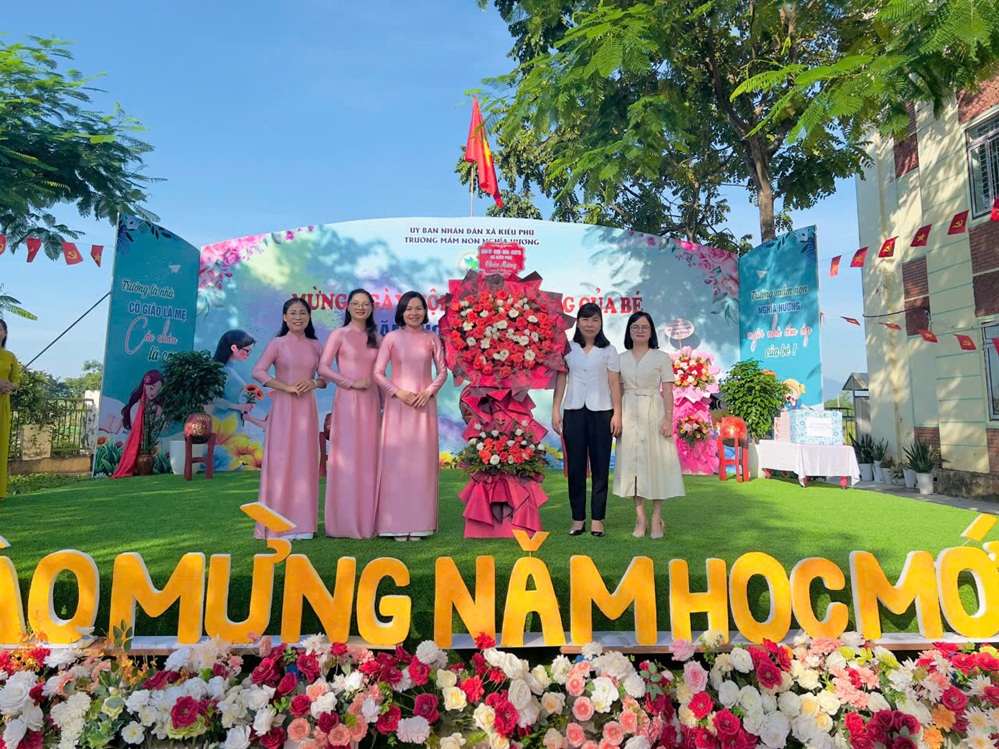Đại diện UBND xã Kiều Phú tặng hoa trường mầm non Nghĩa Hương (ảnh: TT VH- TT - TT Kiều Phú)