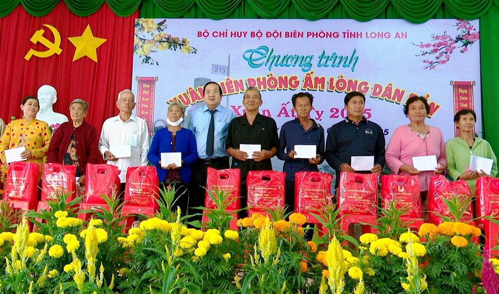Tại Long An, chương trình “Xuân Biên phòng ấm lòng dân bản” năm nay Bộ chỉ huy BĐBP Long An và các đơn vị đồng hành tổ chức nhiều hoạt động thiết thực chăm lo Tết cho Nhân dân ở khu vực biên giới, gia đình chính sách, gia đình có hoàn cảnh khó khăn trên địa bàn biên giới đón xuân vui tươi, lành mạnh, tiết kiệm với tinh thần “Không để ai bị bỏ lại phía sau”; tăng cường tình đoàn kết gắn bó máu thịt “Quân – dân”, tô thắm phẩm chất cao đẹp của “Bộ đội Cụ Hồ” trong tình hình mới. Trong khuôn khổ Chương trình, vừa qua các đơn vị đã khám bệnh, cấp thuốc miễn phí cho 100 người dân; tặng 140 suất quà cho các gia đình chính sách, hộ nghèo trên địa bàn và trao học bổng “Nâng bước em đến trường” cho các em học sinh có hoàn cảnh khó khăn trên địa bàn xã Tân Hiệp, Thuận Bình thuộc huyện Thạnh Hóa, tỉnh Long An.