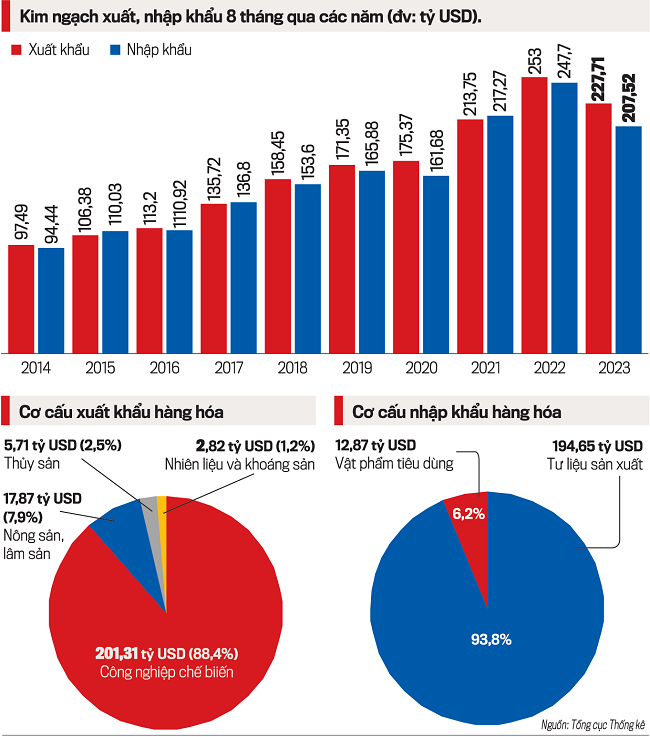 Tính chung 8 tháng năm 2023, kim ngạch xuất khẩu hàng hóa ước đạt 227,71 tỷ USD, giảm 10% so với cùng kỳ năm trước. Trong đó, khu vực kinh tế trong nước đạt 59,92 tỷ USD, giảm 9,2%, chiếm 26,3% tổng kim ngạch xuất khẩu; khu vực có vốn đầu tư nước ngoài (kể cả dầu thô) đạt 167,79 tỷ USD, giảm 10,3%, chiếm 73,7%. Đáng chú ý, trong 8 tháng qua có 30 mặt hàng đạt kim ngạch xuất khẩu trên 1 tỷ USD, chiếm 91,8% tổng kim ngạch xuất khẩu (có 5 mặt hàng xuất khẩu trên 10 tỷ USD, chiếm 58,4%).