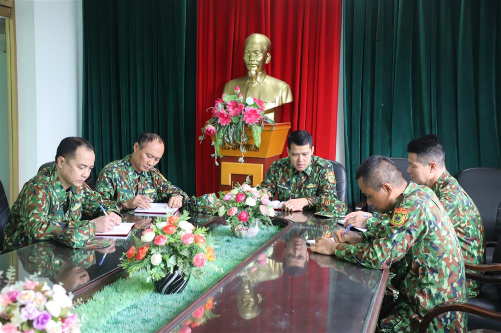 Đại uý Nguyễn Văn Vương, Đảng ủy viên, Trạm trưởng Trạm Kiểm soát Biên phòng Lục Lầm đang cùng các cán bộ biên phòng thuộc đơn vị triển khai kế hoạch đấu tranh phòng chống tội phạm trên địa bàn.