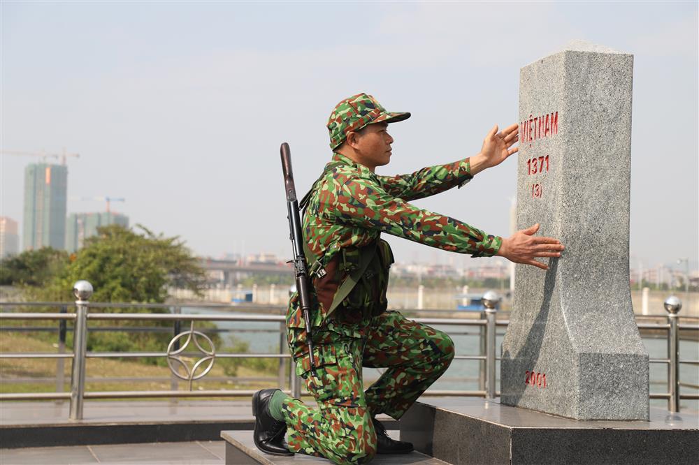 Hình ảnh các chiến sỹ biên phòng đồn Hải Hòa thực hiện kiểm tra cột mốc biên giới 1371.