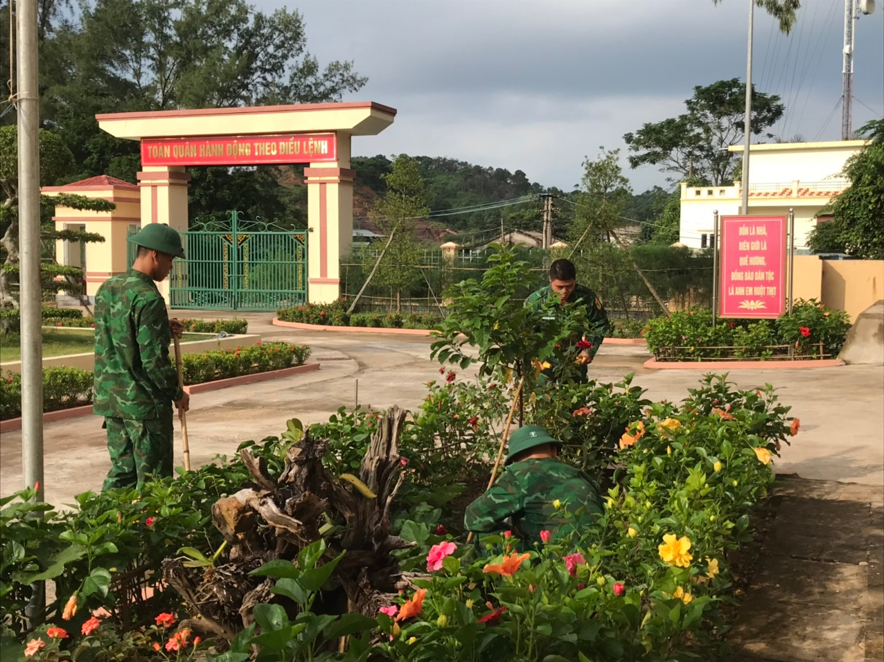 Các cán bộ, chiến sỹ trồng và chăm sóc hoa, cây cảnh trong khuôn viên đơn vị.