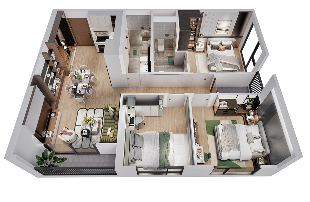 Nếu như căn hộ 1-2 phòng ngủ thích hợp cho các đôi vợ chồng trẻ hoặc chỉ mới có 1 con thì với những gia đình đông thành viên hơn, căn hộ 3 phòng chính là không gian lý tưởng. Trên thực tế, chỉ cần nhà có từ 5 thành viên thì các căn hộ 2 phòng ngủ dần trở nên chật chội. Đối với những gia đình đa thế hệ, họ cần căn nhà dễ dàng phân chia các không gian chức năng rộng rãi hơn, chuyển đổi mục đích từng phòng lúc cần, yên tâm an cư lâu dài mà không phải đổi nhà khi có thêm thành viên.