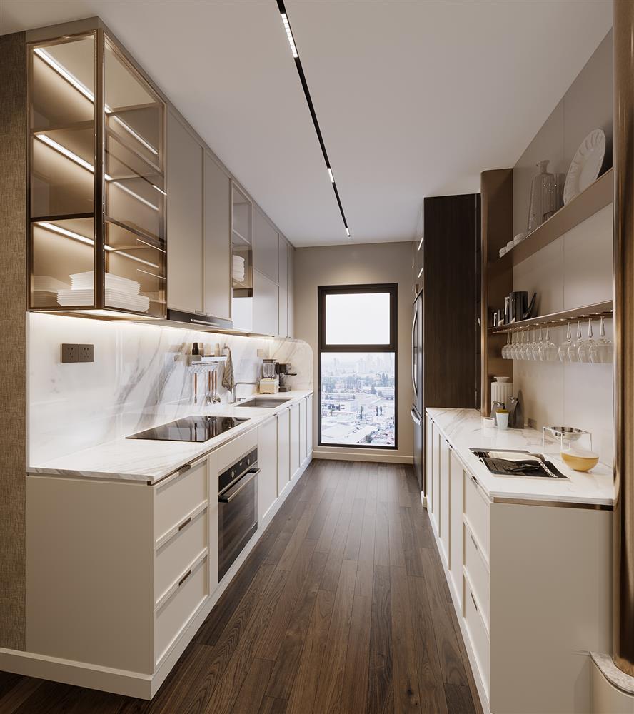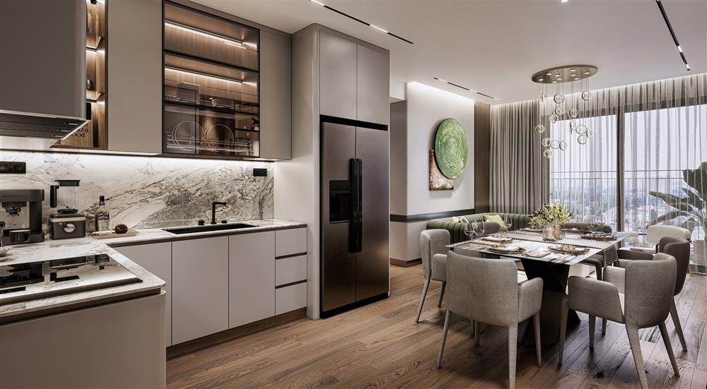 Phòng khách và khu bếp căn hộ 3PN được thiết kế liên thông với nhau tạo nên không gian rộng mở cho khu vực sinh hoạt chung của căn hộ. Phòng ngủ master được thiết kế ấn tượng với sự sang trọng, tiện nghi