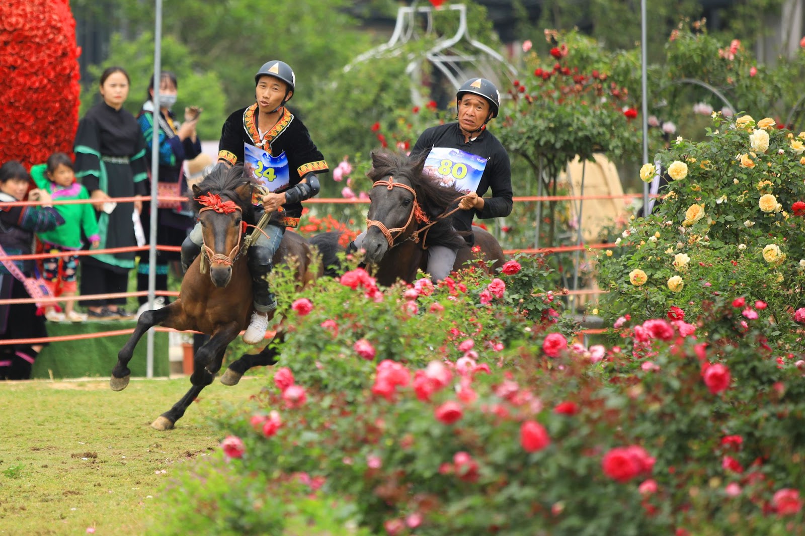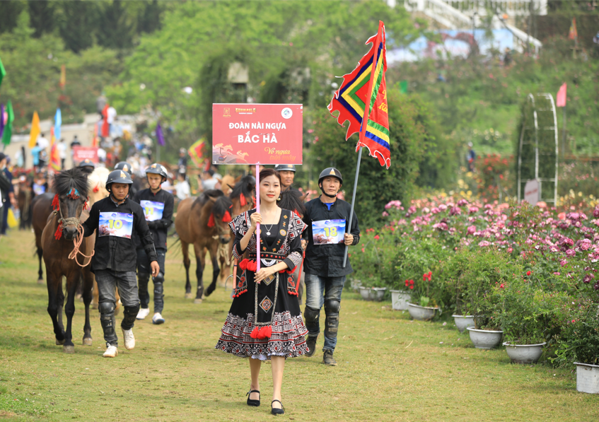 Sau nghi thức châm đuốc khai hội thiêng liêng cùng lời tuyên thệ về một mùa giải công bằng và an toàn tới từ tổ trọng tài và vận động viên, tại sân khấu vườn hồng ga đi cáp treo của khu du lịch Sun World Fansipan Legend, hàng ngàn du khách hào hứng với màn diễu hành ngựa đua ngợp sắc cờ hoa của 30 nài ngựa trong trang phục dân tộc đặc trưng.
