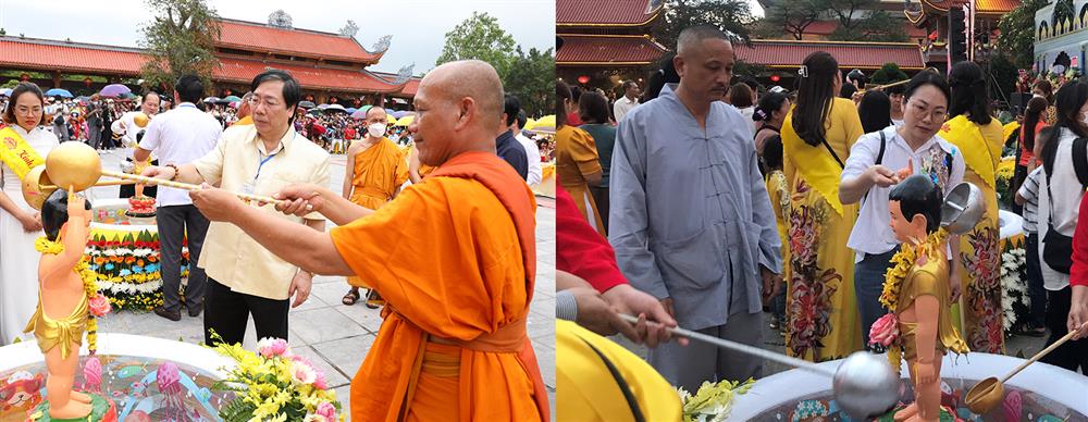 Một trong những nghi thức trang trọng và ý nghĩa nhất mừng ngày phật ra đời là nghi thức tắm cho Phật hay còn gọi là “Tắm Phật”. Hàng vạn du khách, tăng ni phật tử cùng nhiều lãnh đạo trung ương, địa phương đã xếp hàng thực hiện nghi thức trang trọng này.