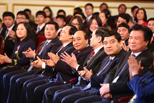 Thủ tướng Nguyễn Xuân Phúc và Bộ trưởng Phùng Xuân Nhạ trao Huân chương Lao động hạng Nhất và Bằng khen cho em học sinh đoạt giải.