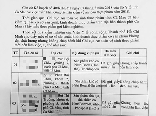 Theo thông tin đăng tải trên website của Chi cục An toàn vệ sinh thực phẩm tỉnh Cà Mau đã phát hiện có ít nhất 3 cơ sở sản xuất, kinh doanh thực phẩm là mặt hàng cá khô, thực phẩm ăn nhanh trên địa bàn có sản phẩm không đạt chất lượng. Cụ thể, sản phẩm khô có chứa Natri Borat (hàn the) và Trichlorfon (một loại chất độc có trong thuốc trừ sâu) tại 2 cơ sở trên đường Phan Bội Châu (phường 7, TP Cà Mau) và phát hiện sản phẩm chả lụa, chả chiên có chứa chất Natri Benzoat, nhóm Phosphat (P2O2- chất dùng để tạo độ xốp, chống ăn mòn trong ngành công nghiệp) tại một cơ sở trên đường Bùi Thị Trường (khóm 6, phường 5, TP Cà Mau). Đáng lưu ý, cơ quan quản lý nhà nước đã nhiều lần gửi giấy mời yêu cầu các cơ sở đến làm việc. Tuy nhiên, thay vì chấp hành thì các cơ sở này lại “bặt vô âm tín”.