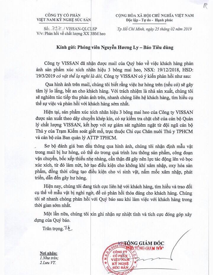 Trên tinh thần thượng tôn người tiêu dùng, chúng tôi đề nghị Vissan có buổi làm việc trực tiếp để làm rõ những thông tin, khiếu nại của bạn đọc cũng như chất lượng sản phẩm xúc xích 3 Bông Mai heo, nguyên nhân thực sự khiến sản phẩm mốc đen khi vẫn còn hạn sử dụng,... để đảm bảo quyền lợi chính đáng cho người tiêu dùng.