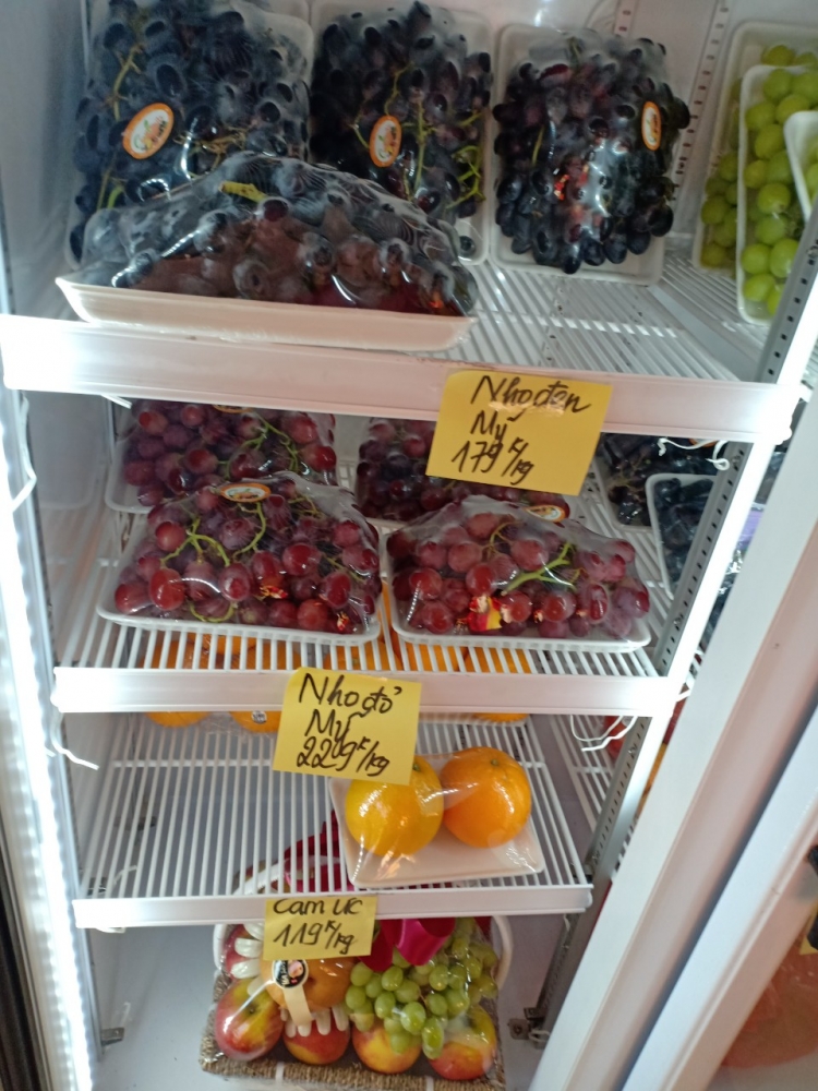 Nhân viên tại cơ sở này khẳng định: “Nhiều mặt hàng thì nhiều sản phẩm khác nhau như nho đen, nho đỏ, nho xanh đều là của Mỹ hết, cam là của Úc, còn táo, kiwi là của New Zealand… Tem ở nước ngoài người ta dán khi mình nhập về, còn tem phụ dán thêm là bên tôi thì có nhưng chưa dán vào, dán vào sẽ có SĐT, địa chỉ của công ty, dán vào đơn giản mà. Thường khách không muốn có ngày nhập hay giá ở trên đó nên không dán, chẳng ai nhìn ngày nhập đâu, người ta nhìn quả tươi ngon thì mua thôi. Vì khách bên tôi chủ yếu mua đi biếu là nhiều”.
