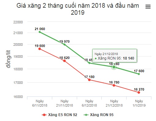 Liên Bộ Công Thương - Tài chính vừa phát đi thông tin về điều chỉnh giá bán lẻ xăng dầu trong ngày đầu tiên của năm mới 2019. Theo đó, từ 1/1/2019, mỗi lít xăng E5 RON 92 giảm 515 đồng, xăng RON 95 là 538 đồng. Các mặt hàng dầu giảm sâu hơn, 733-1.092 đồng một lít, kg tuỳ loại.
